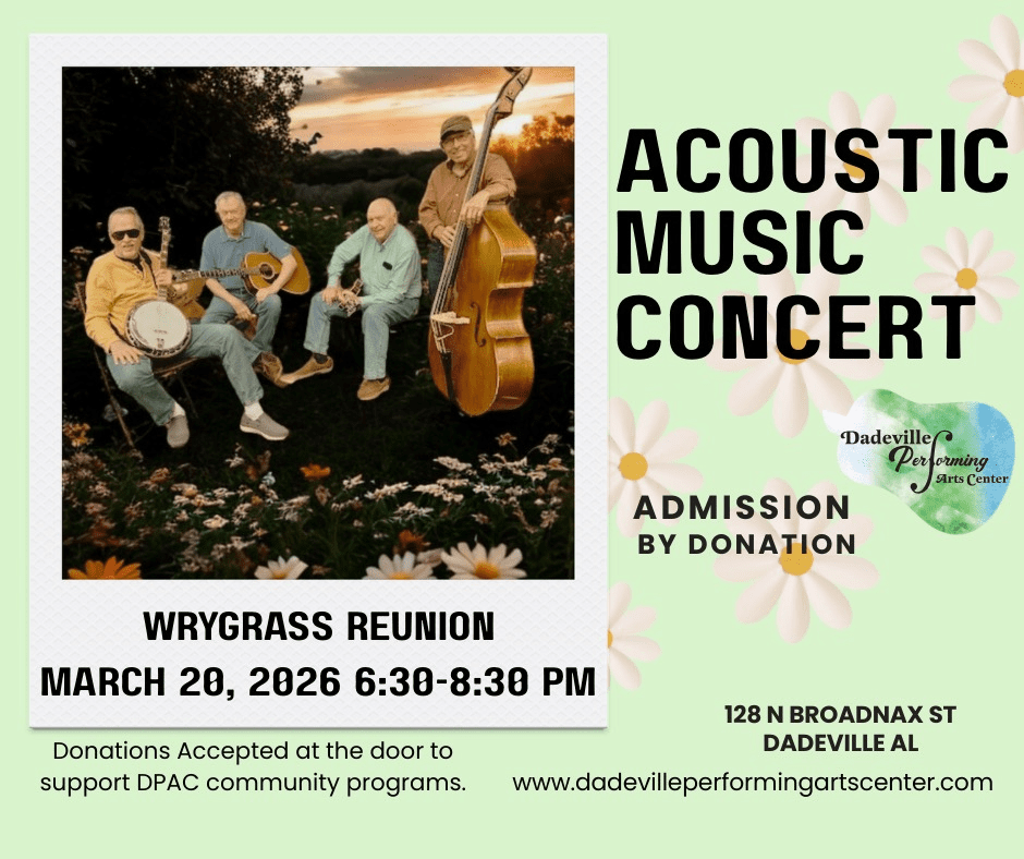 Dadeville Performing Arts Center 128 N. Broadnax Street, Dadeville, ALWrygrass is back for another wonderful performance at the Dadeville Performing Arts Center. If you missed it, they sold out their last performance and expect a big crowd again. Admission ... Read more
