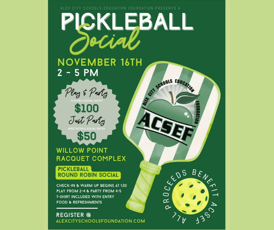 The Alexander City Schools Education Foundation invites the community to a Pickleball Social on November 16, 2025, at the Willow Point Racquet Complex. Check-in and warm-ups begin at 1:30 PM, followed by pickleball play from 2:00–4:00 PM. A social hour for both players and spectators will take place from 4:00–5:00 PM. Player entry (ages 18+) is $100, and spectator/social admission is $50. Proceeds support enhanced technology, teacher grants, cultural learning opportunities, and school safety initiatives throughout Alexander City Schools. To learn more or to register, please visit https://www.alexcityschoolsfoundation.com/pickleball-social.