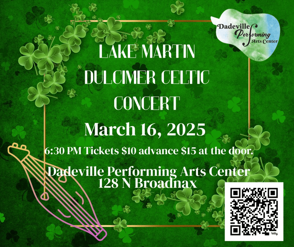 Lake Martin Dulcimer Club invites you to join us at the Dadeville Performing Arts Center for a Celtic performance. Tickets: $10 advance, $15 at the door. Just scan the QR code to get yours today.