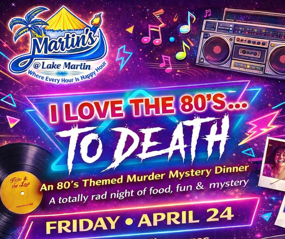 Step back into the neon-soaked glamour of the 1980s for “I Love the 80s to Death,” an interactive Murder Mystery Dinner at Martins at Lake Martin on Friday, April 24. Hosted on the Back Deck at Martins, this high-energy evening combines big hair, bold fashion, and a thrilling whodunit experience. Guests are encouraged to dress in their favorite ’80s attire and enjoy a fully immersive night of entertainment. The $65 ticket includes hors d’oeuvres by Amazin Grazin, one drink ticket, a steak dinner by Chef Scott Blake, dessert, and the interactive murder mystery experience. With only 100 tickets available, this limited-capacity event is expected to sell out quickly. Tickets are available online through Eventbrite.