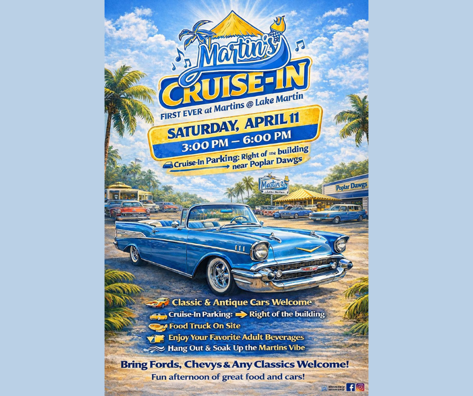 Martin’s at Lake Martin is hosting a Classic Car Cruise-In, and we want to see those beautiful rides roll in! If you’ve got a classic car, antique car, muscle car, or vintage ride, shine it up and cruise it over to Martins to show it off. Don’t have a classic car? No problem! Come walk around, check out the cars, talk with the owners, and enjoy a fun afternoon on the lake. Bring your friends, bring the family, grab some food, enjoy a drink, and soak in that Martins vibe while checking out some beautiful machines.