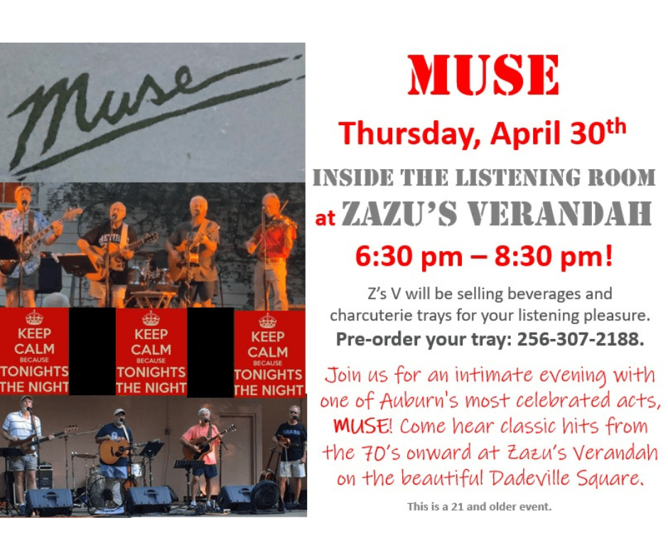 Zazu’s Verandah is pleased to present Muse! (Auburn, AL) performing inside the air-conditioned Listening Room at Zazu’s Verandah, located on the Dadeville Square! You don’t want to miss getting to hear them live in a Listening Room environment! Together, we’re going to hear listening, vocal oriented acoustic, soft rock played as only Muse can. Performing for over 48 years, (they have an amazing audience following), MUSE will perform fan favorites