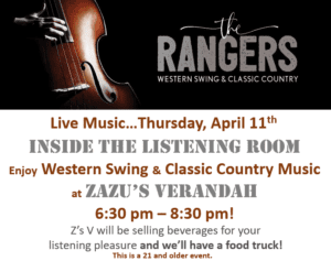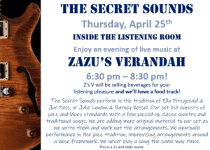 The Secret Sounds at Zazu’s Verandah! Zazu’s Verandah will again host free music every Thursday from April 4 – August 22, 2024. …AND we’ll have a Food Truck! We ask
